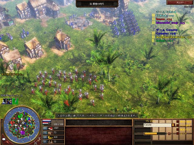 「ワッショイ!」市場が炎上した!中華軍の仕業である。この事が後々Cenote軍の資源変換を困難にするのである。市場を建築するのに必要な木はわずかに100。しかしその100を得るためにいかほどの時間が必要であるか!わずかな時間である。しかしそのわずかな時間が生死を分けることがあるのがこの戦いであった。