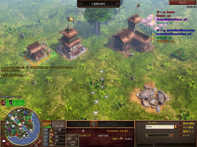 アステカが押してきます。この点数でこの軍量ということは内政はほぼなくなっているのではないかと。あ、農民12人いますね。まだ二桁いるなら大丈夫!